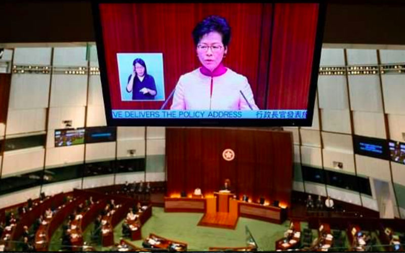 HK leader cancels policy speech as lawmakers interrupt meeting